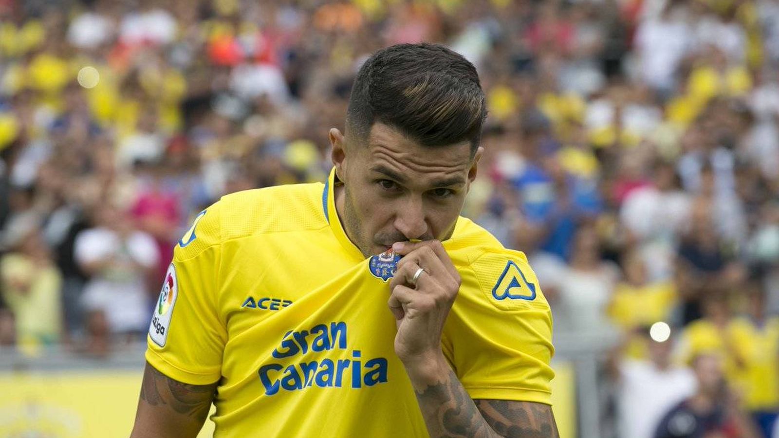 Vitolo llega con aire en la camiseta para el partido de Huesca vs Las Palmas