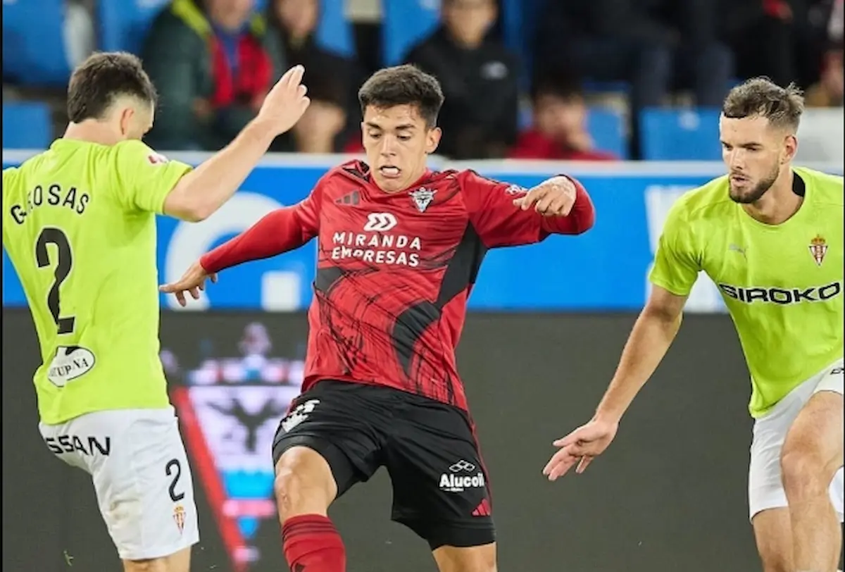 El arranque fue exigente. El Mirandés salió con chispa y obligó a Yáñez a volar a los cinco minutos con una estirada de poste a poste para evitar el gol de Pablo Pérez. El Sporting respondió con iniciativa y distancia corta: robo, transición y tiro de Cortés desde la frontal. El plan funcionaba mejor con el paso de los minutos, con una presión que robaba rápido y acercaba a los gijoneses al área rival.